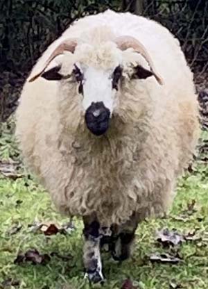 Mabel Mabel is new to our flock. We love her distinguished look with her spreading horns and outgoing personality. She is a large ewe with lovely long wool. She is bred to 100% Valais Blacknose ram for